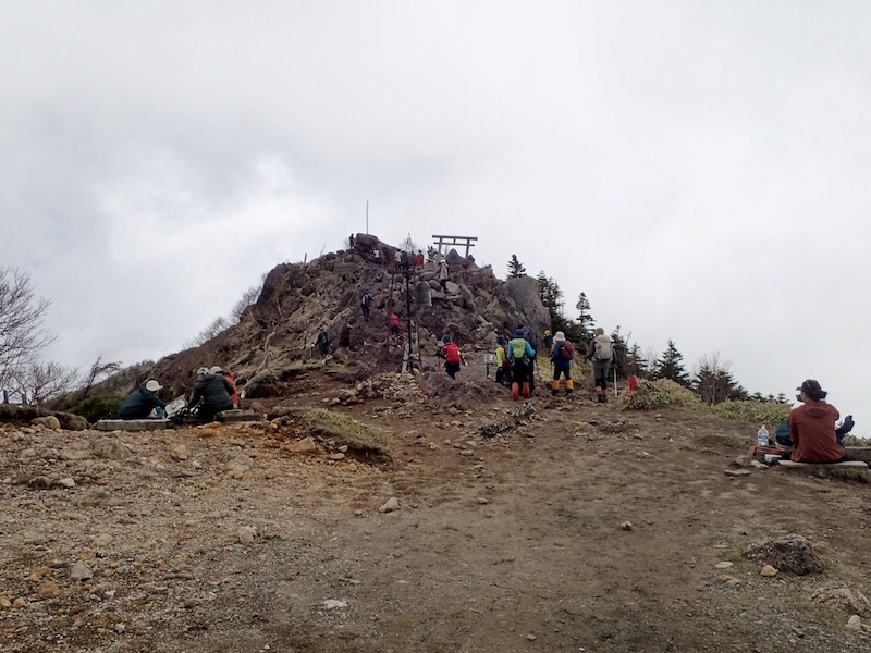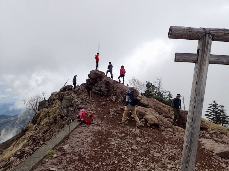 頂上付近はガスっていますが、大勢の人がいます。風もあるので身体が冷えてきます。バナナとソーセージを食べて早速下山します。天空に向かってすっくと立つ刀は写真スポットです。