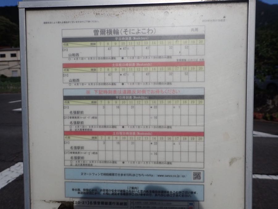 バス停の時刻表を見ると、1日に上下とも5便あります。各地で次々にバスの運行が廃止に追い込まれている中、まだ便数はある方ではないでしょうか。貴重です。