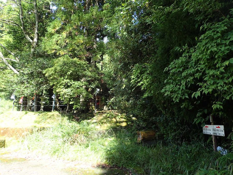 延命地蔵(通称、目無し地蔵)は眼病に効くとか、ダルマに目を入れる習慣からか「選挙前には参る」との通説もあると地元の方と思われるブログも見ました。ダルマに目を入れるというのも今となっては過去のことだろうか。この右手に道が延びていそうなのですが、藪が濃いので引き返していると、後続のトレラン風の男女2人と合流。3人で突入しかけましたが、車道沿いに登山口があると聞き私だけ安全牌をとって車道から向かうことにしました。