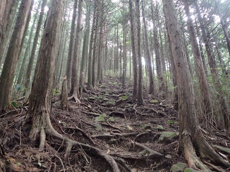 杉林の中を降りていき、沢の流れを渡っところから急登が始まりました。