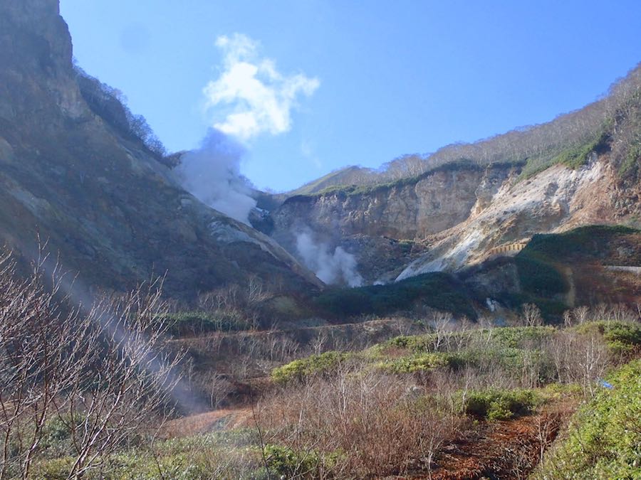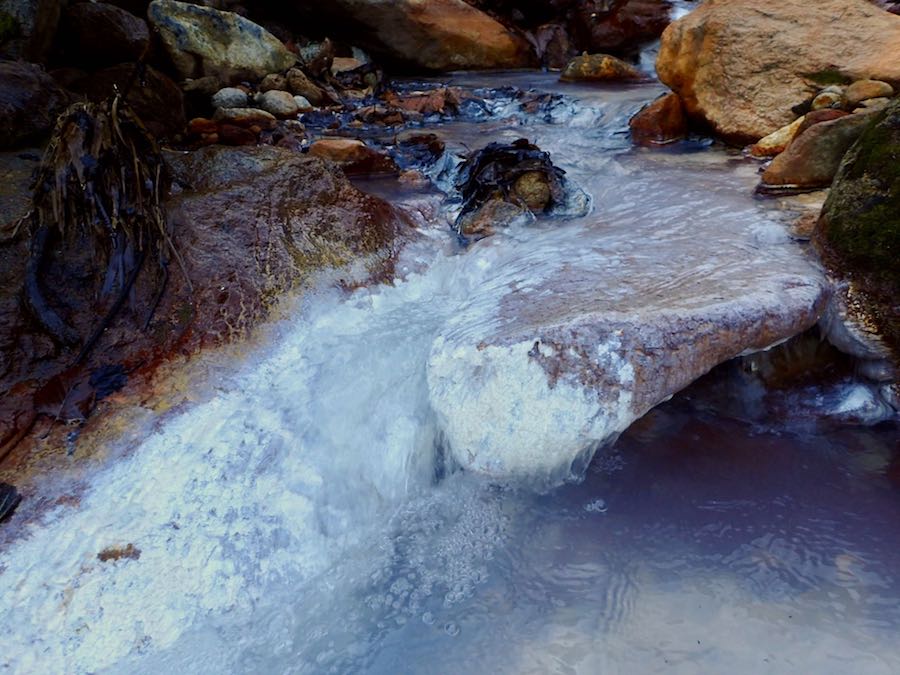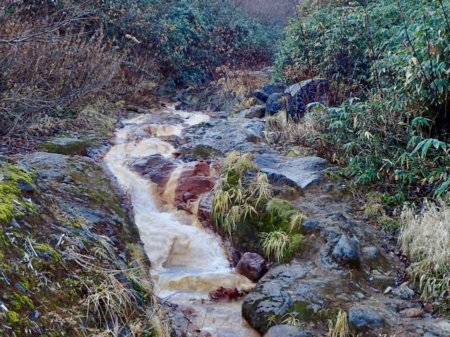 北地獄谷は白くなっていて…近づいてみると、やっぱり湯の花ができていました。川一面が白くなるってすごいですね。